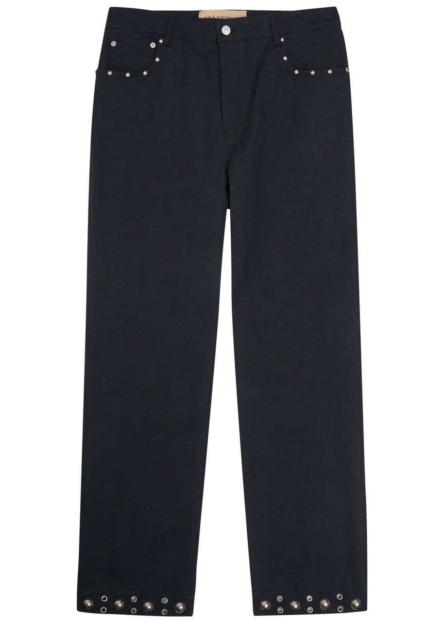 Straight-Leg Embellished Linen and Cotton-Blend Trousers Navy