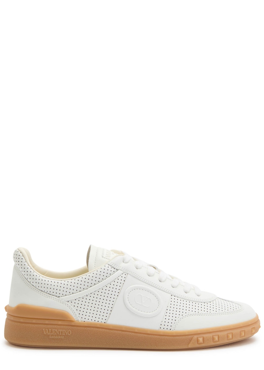 Info & Care Valentino Garavani leather sneakers Perforated panels, rubberised designer plaque at padded tongue, VLogo embossed applique at side, padded ankle, embossed logo and Rockstuds at textured rubber midsole, rubber sole, round toe Lace-up front Size & Fit Only available in full sizes, go up to the nearest whole size if you take a half size;