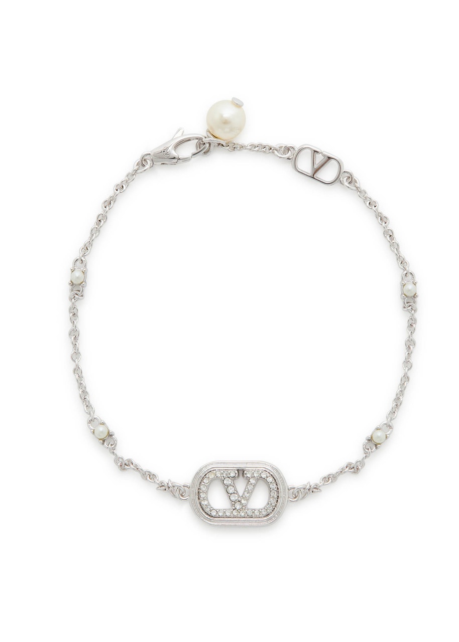 Info & Care Valentino Garavani metal bracelet; Crystal-embellished;VLogo plaques, Swarovski pearl embellishments Adjustable lobster-clasp fastening; Presented in a designer-stamped box with a pouch Size & Fit Length: 18cm