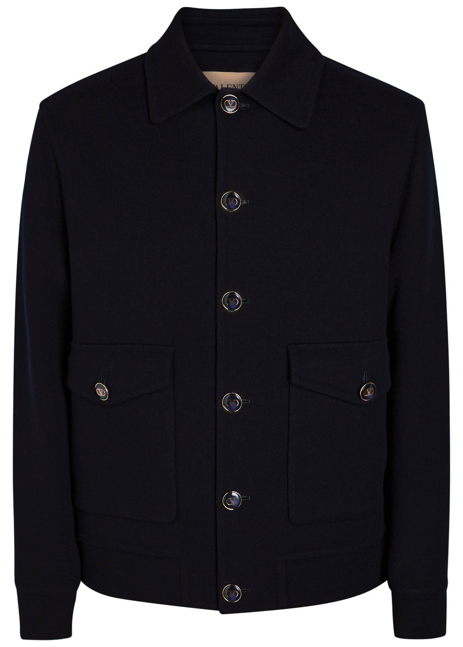 Info & Care Valentino wool and cashmere-blend jacket; Button-fastening cuffs, two button-fastening flap pockets with side slip pockets, VLogo buttons Button fastenings through the front; 90% wool, 10% cashmere Dry clean Size & Fit Length shoulder to hem: 26.5 inches/ 67.5cm Midweight Regular fit Model is 6'3"/ 191cm, chest size 38 inches and wears a size IT48