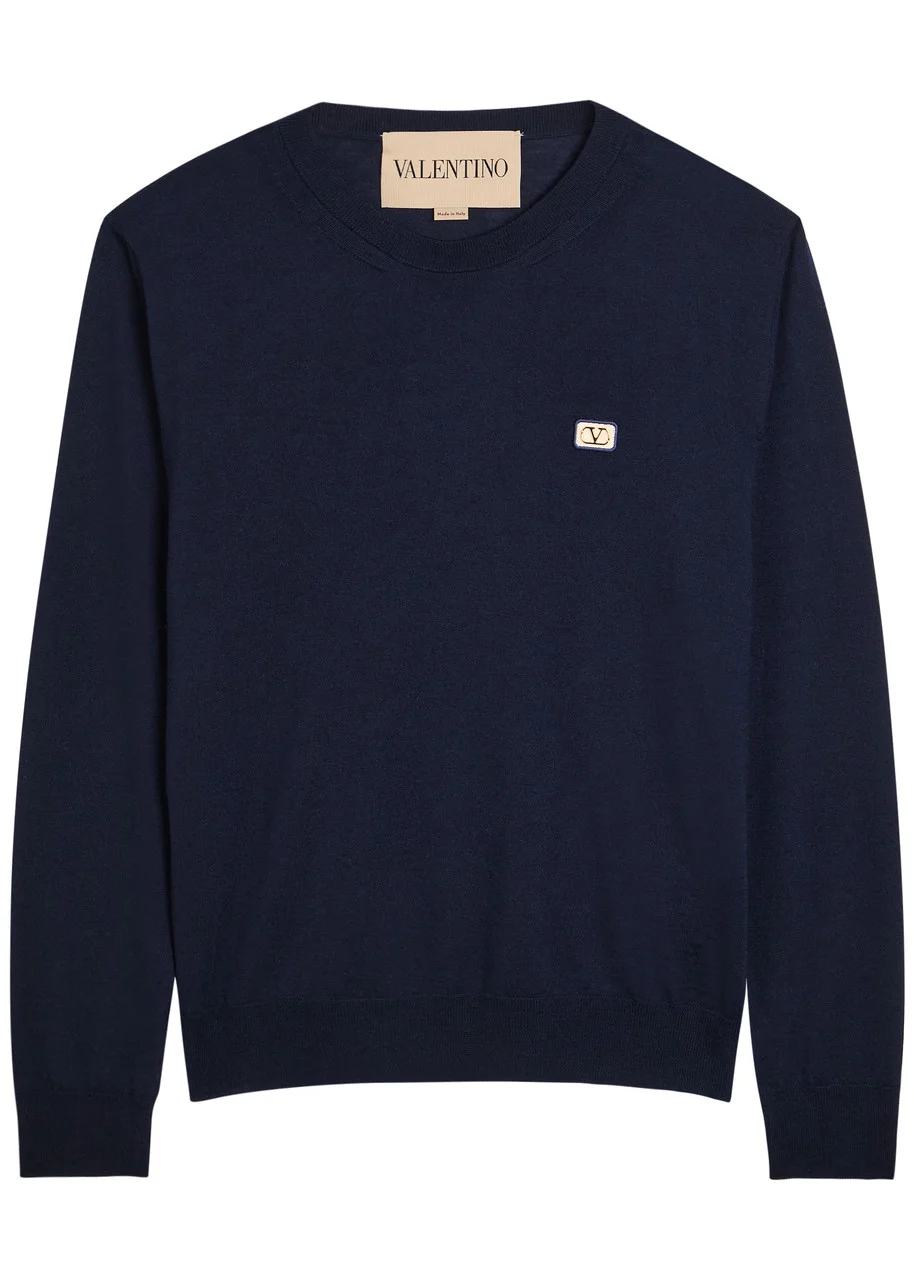 Info & Care Valentino wool jumper Crew-neck, designer plaque at chest, ribbed trims Slips on 100% virgin wool Dry clean Size & Fit Length shoulder to hem: 25 inches/ 63.5cm Midweight Regular fit Model is 6'2"/ 188cm, chest size 38 inches and wears a size medium