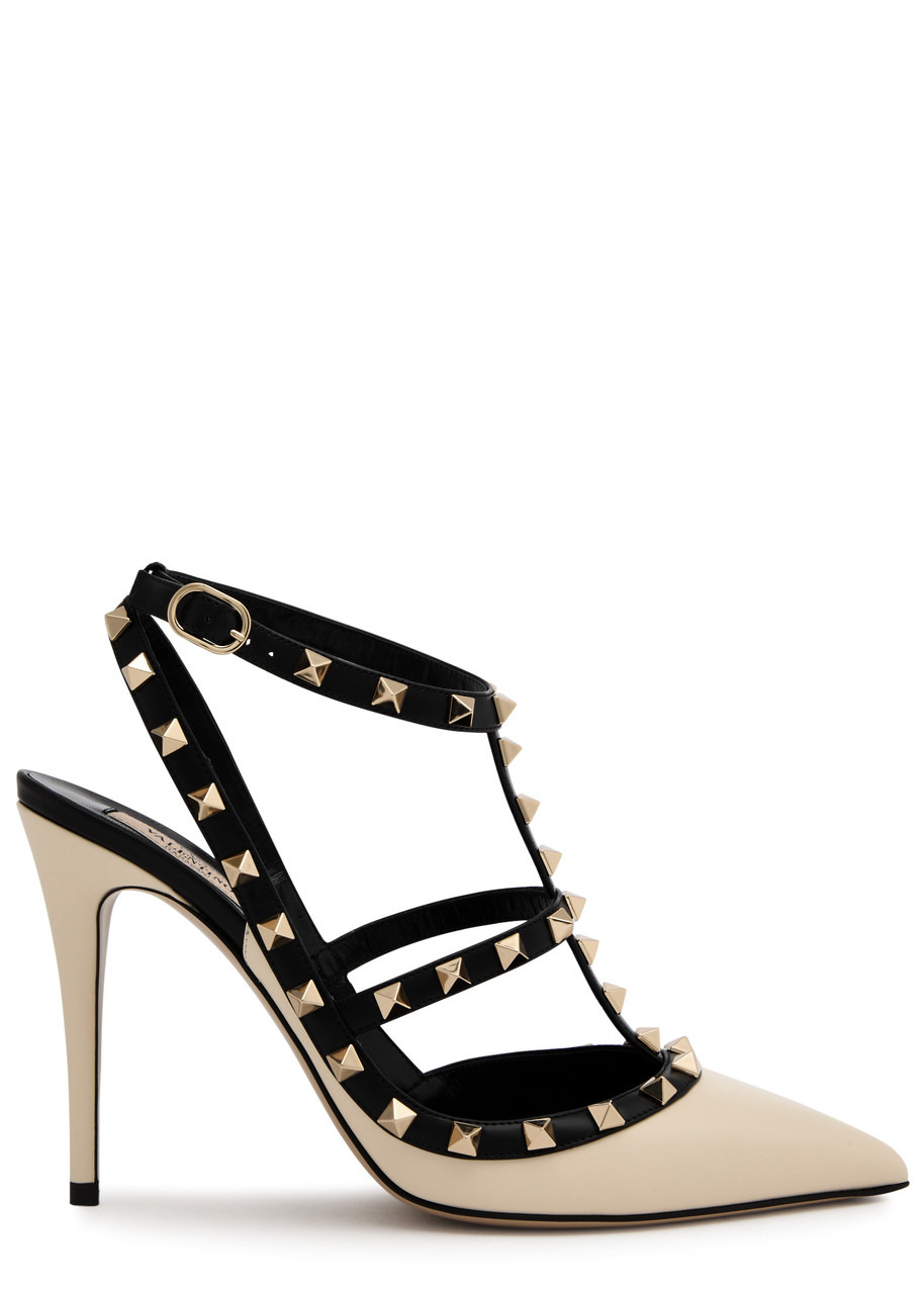 Info & Care Valentino Garavani leather pumps Heel measures approximately 4 inches/ 100mm Rockstud embellishments, cut-out sides, pointed toe Adjustable buckle-fastening ankle strap Size & Fit Only available in full sizes, go up to the nearest whole size if you take a half size