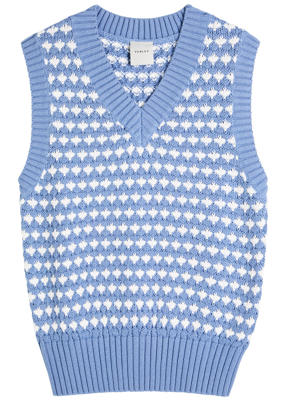 Info & Care Varley knit vest Patterned intarsia, V-neck, ribbed trims Slips on 60% cotton, 40% polyester Dry clean Size & Fit Length shoulder to hem: 24.5 inches/ 62cm Midweight Relaxed fit Model is 5'9"/ 175cm and wears a size small