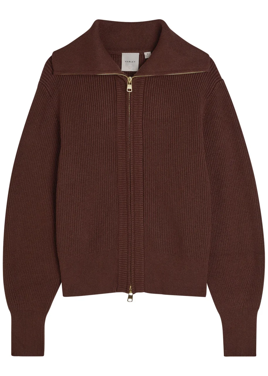 Info & Care Varley knit cardigan Ribbed, high-neck, rounded sleeves Two-way zip fastening through front 42% viscose, 30% polyester, 20% nylon, 8% lyocell Machine wash Size & Fit Length shoulder to hem: 22 inches/ 56cm Midweight Regular fit Model is 5'10"/ 178cm and wears a size small