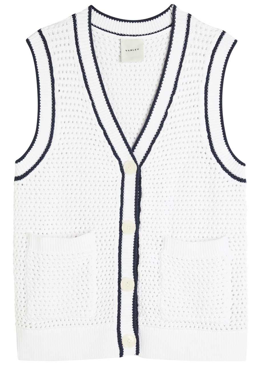 Info & Care Varley open-knit vest V-neck, two patch pockets, contrasting ribbed trims Button fastenings through front 60% cotton, 40% polyester Dry clean Size & Fit Length shoulder to hem: 24 inches/ 61cm Midweight Relaxed fit Model is 5'9"/ 175cm and wears a size small