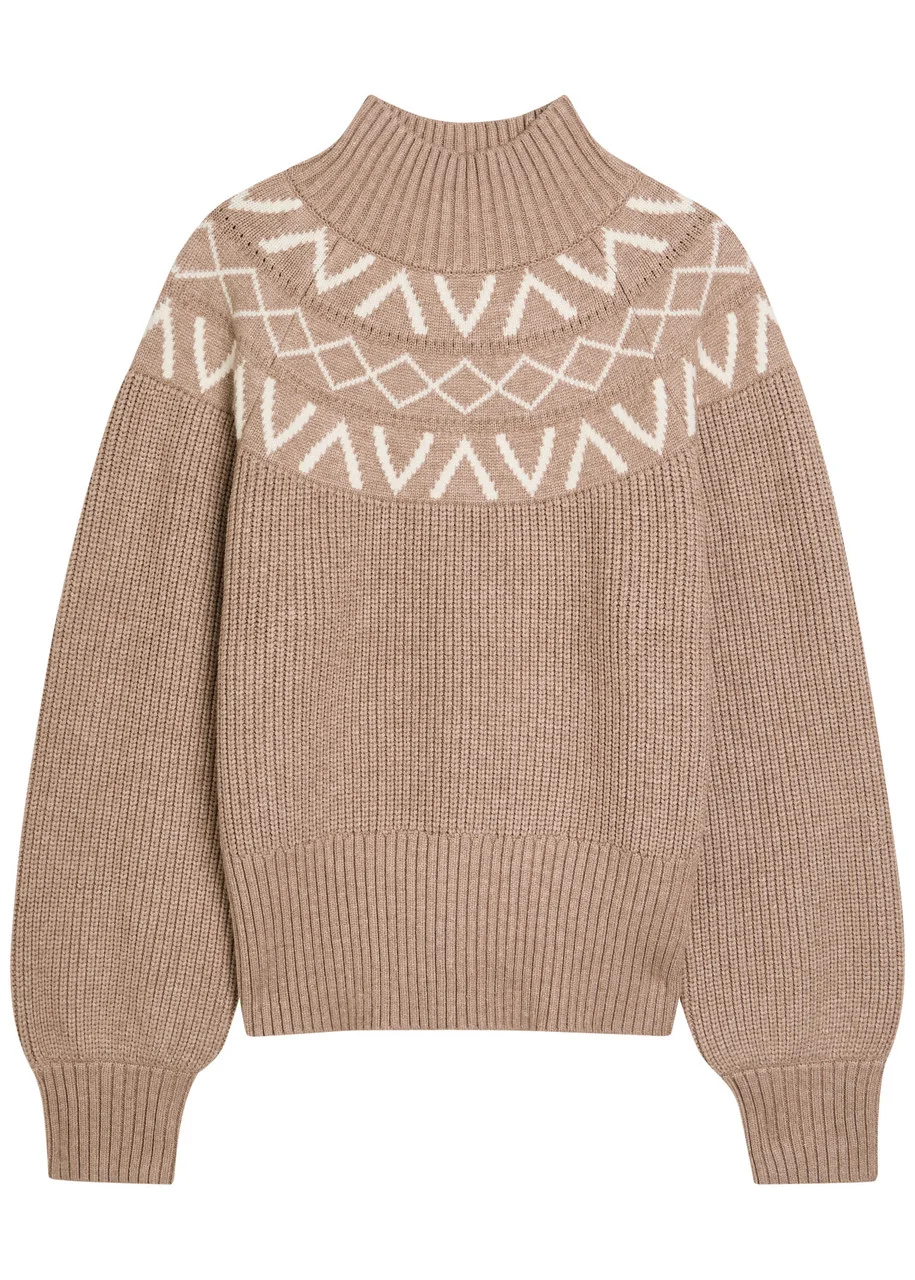 Info & Care Varley knit jumper Fair Isle intarsia, high-neck, raglan sleeves, ribbed trims Slips on 42% viscose, 30% polyester, 20% polyamide, 8% lyocell Machine wash Size & Fit Length shoulder to hem: 23 inches/ 58.5cm Midweight Relaxed fit Model is 5'10"/ 178cm and wears a size small