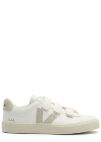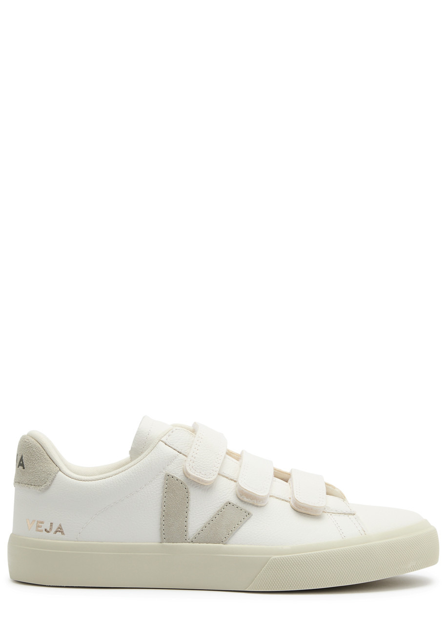 Info & Care Veja grained leather sneakers Logo-debossed tongue, suede V logo applique at side, designer-stamped side, designer-stamped suede heel panel, textured rubber midsole, rubber sole, round toe Adjustable Velcro-fastening straps; Size & Fit Only available in full sizes, go up to the nearest whole size if you take a half size;