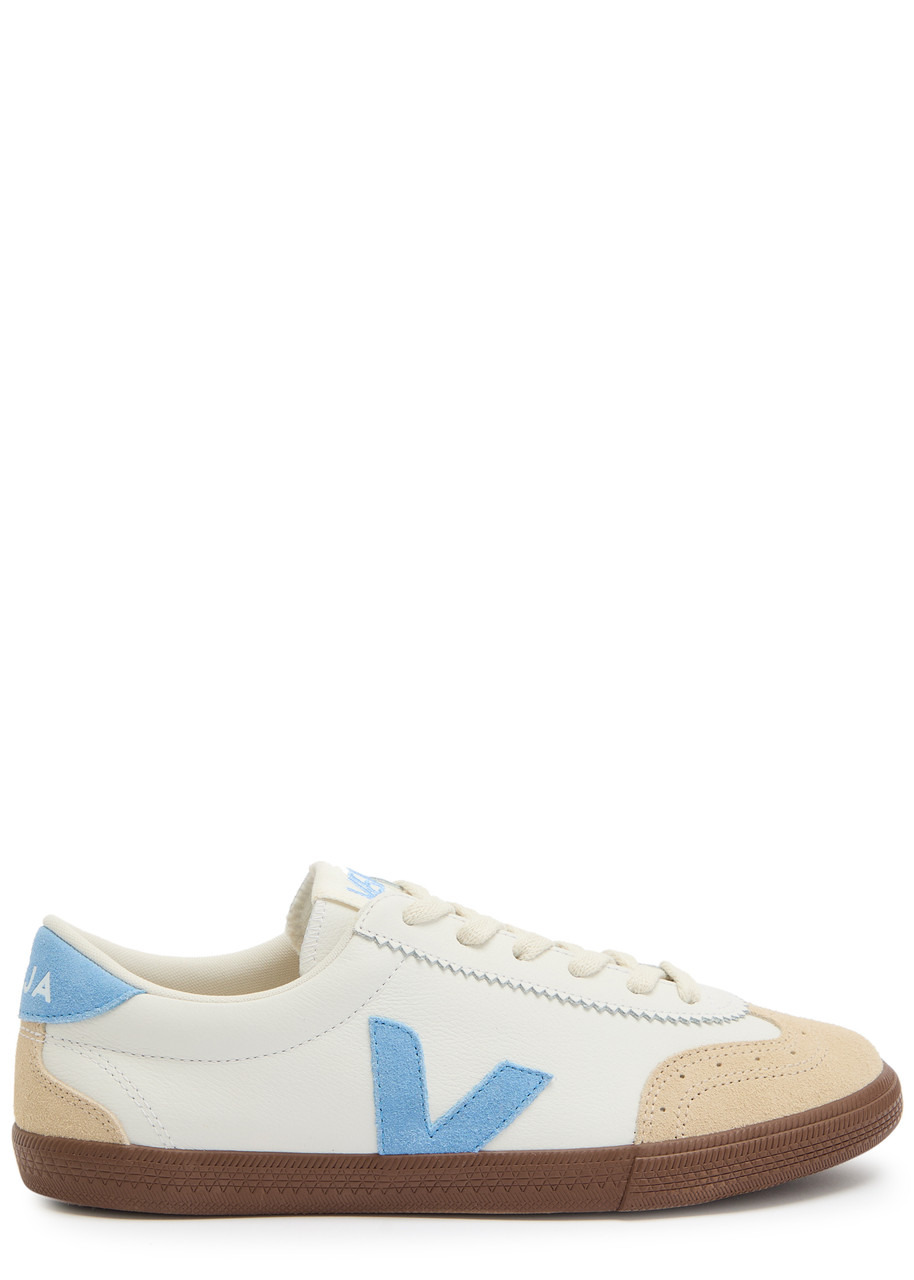 Info & Care Veja grained leather sneakers Embroidered designer plaque at tongue, suede V logo applique at sides, suede panels, perforated details, designer stamp at contrasting heel panel, zigzag trims, textured rubber midsole, rubber sole, round toe Lace-up front Size & Fit Only available in full sizes, go up to the nearest whole size if you take a half size