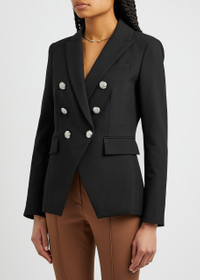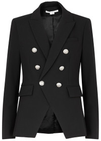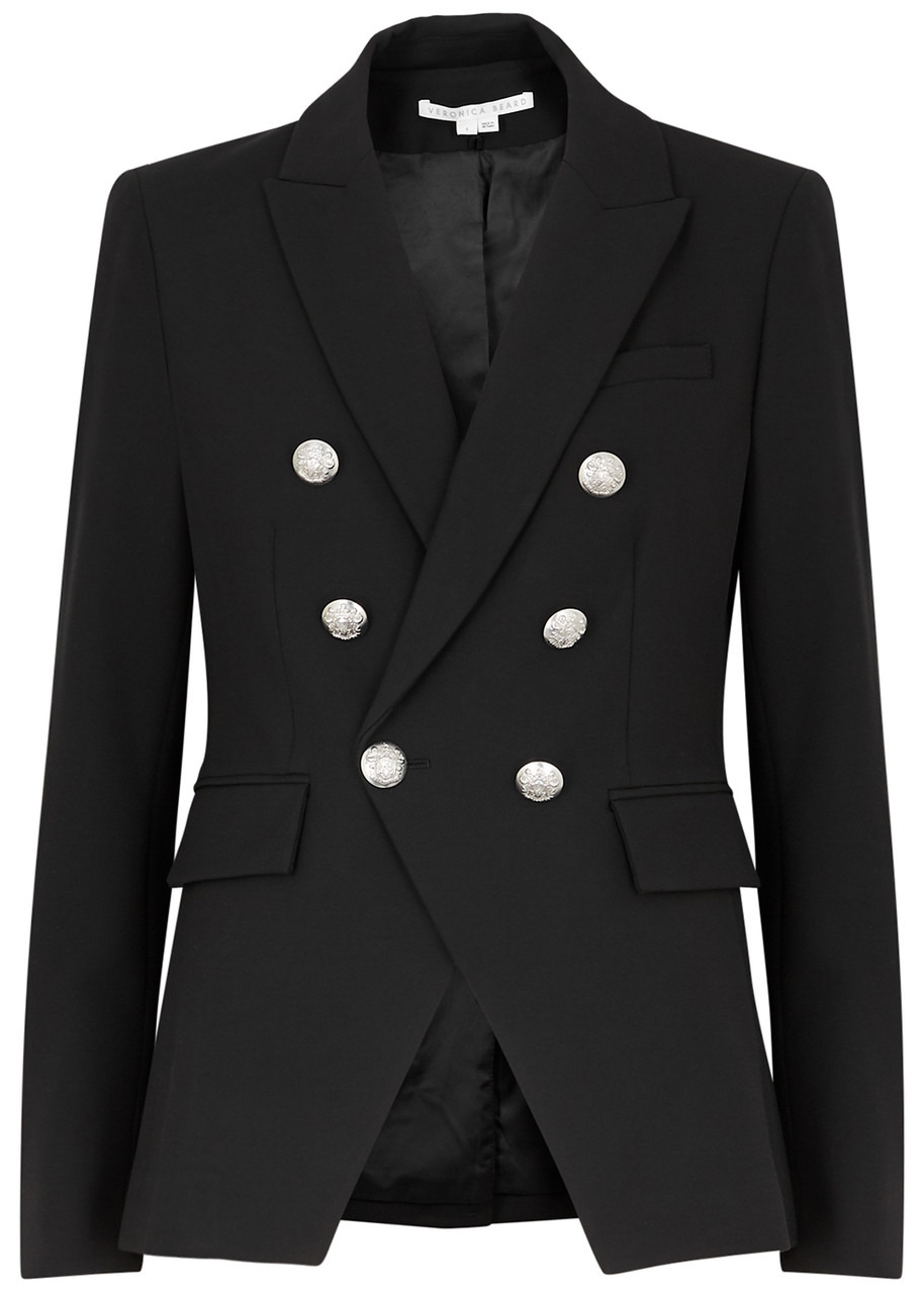 INFO & CARE - Veronica Beard black crepe blazer - Compatible with all Veronica Beard dickeys - Padded shoulders peaked lapels faux chest slit pocket two faux flap pockets button-fastening cuffs silver-tone engraved button embellishments back vent fully lined - Double-breasted button fastening at front - 63% polyester 27% viscose 7% cotton 3% elastane; lining 1: 52% cotton 48% polyester; lining 2: 100% polyester SIZE & FIT - Dry clean - Length shoulder to hem: 26 inches/ 66cm - Midweight - Semi-fitted style fitted at the waist - Model is 5'9"/ 175cm and wears a size UK8/ US4