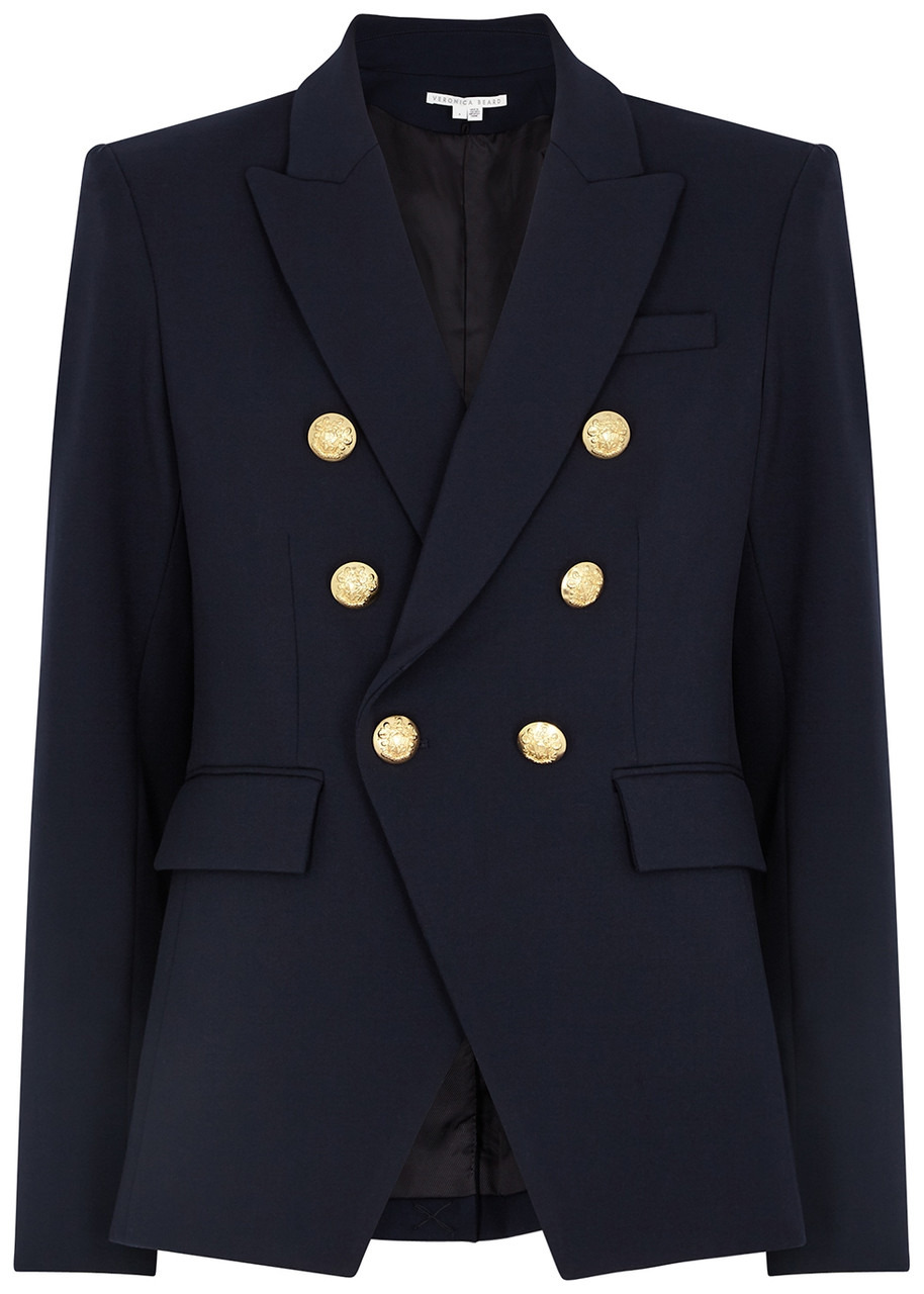 INFO & CARE - Veronica Beard black crepe blazer - Compatible with all Veronica Beard dickeys - Padded shoulders peaked lapels faux chest slit pocket two faux flap pockets button-fastening cuffs silver-tone engraved button embellishments back vent fully lined - Double-breasted button fastening at front - 63% polyester 27% viscose 7% cotton 3% elastane; lining 1: 52% cotton 48% polyester; lining 2: 100% polyester SIZE & FIT - Dry clean - Length shoulder to hem: 26 inches/ 66cm - Midweight - Semi-fitted style fitted at the waist - Model is 5'9"/ 175cm and wears a size UK8/ US4