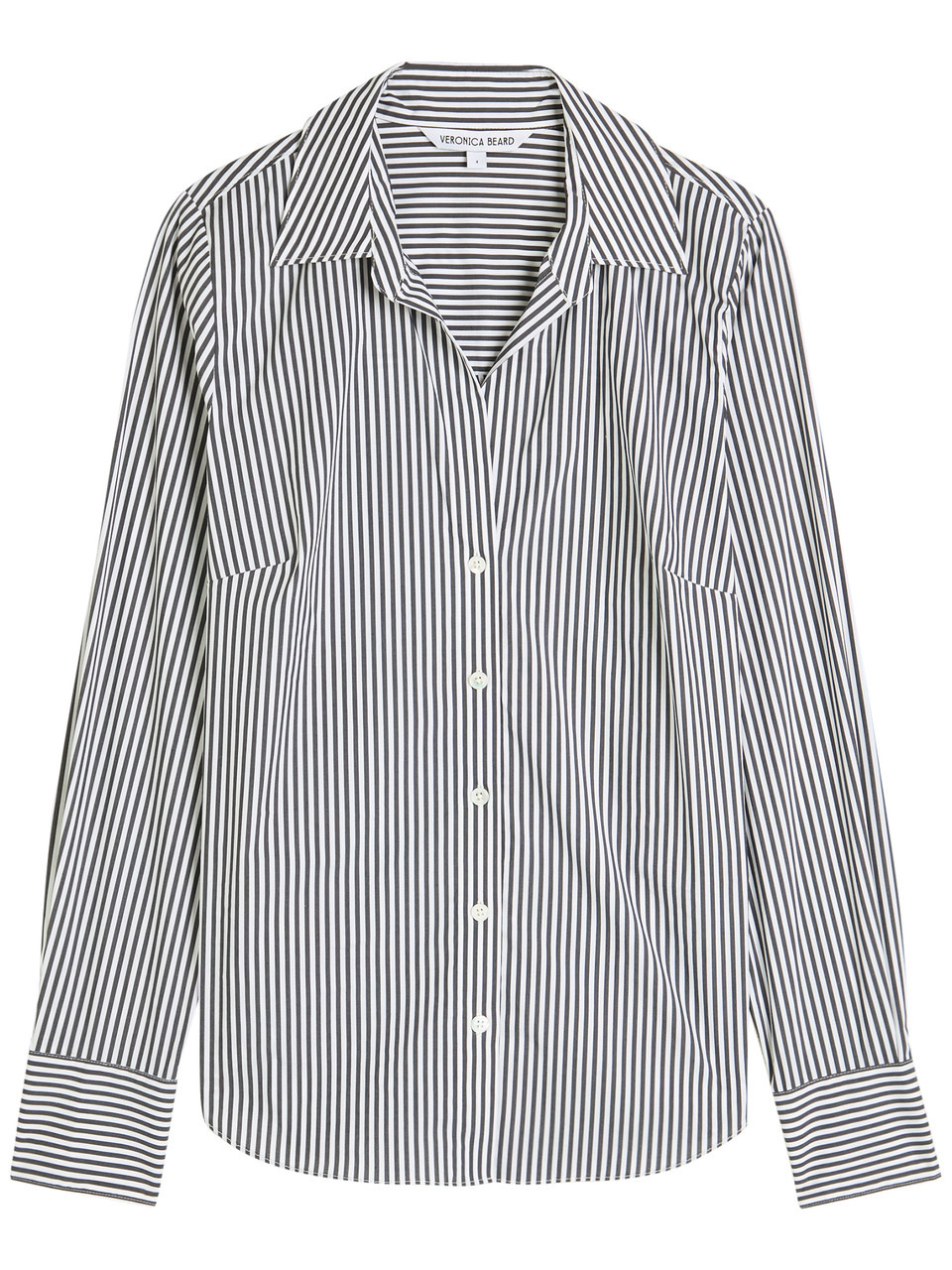 Info & Care Veronica Beard cotton-poplin shirt Striped, open V-neck collar, button-fastening cuffs, darts at sides, box pleat at back, curved hem; Button fastenings through front 84% cotton, 12% polyamide, 4% elastane Dry clean Size & Fit Length shoulder to hem: 25 inches/ 63.5cm Midweight Relaxed fit Model is 5'10"/ 178cm and wears a size;US4