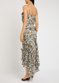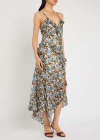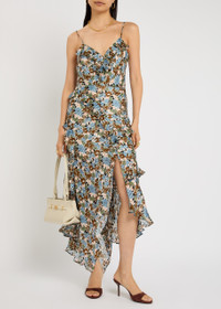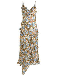 Info & Care Veronica Beard silk dress Floral print, ruffled, V-neck, adjustable shoulder straps, thigh split, asymmetric hem, fully lined; Concealed hook and zip fastening through side 100% silk; lining: 100% polyester Dry clean Size & Fit Length shoulder to hem:;58 inches/ 147cm Midweight Slim fit Loose fitting hem Model is 5'10"/ 178cm and wears a size;US4