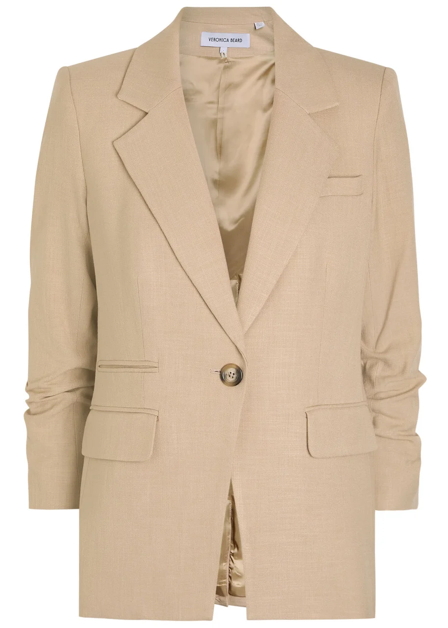 Info & Care Veronica Beard woven blazer Notched lapels, padded shoulders, gathered sleeves, button-fastening cuffs, chest slit pocket, faux slit pocket at front, two front flap pockets, back vent, fully lined Button fastening at front 98% viscose, 2% elastane; lining: 100% viscose Dry clean Size & Fit Length shoulder to hem: 27 inches/ 68.5cm Midweight Slim fit Model is 5'9"/ 175cm and wears a size;US4