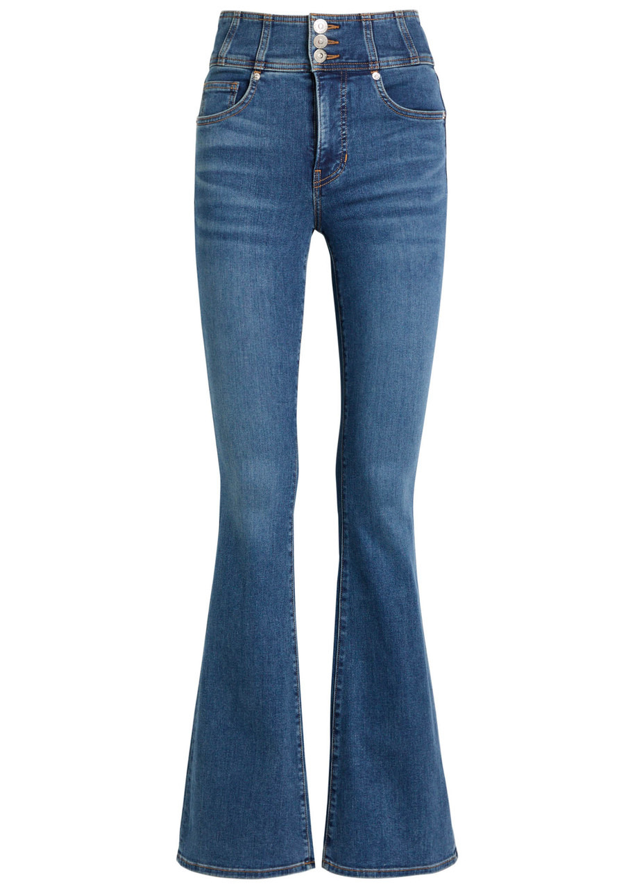 Info & Care Veronica Beard stretch-denim jeans High-rise fit, flared-leg cut, belt loops, five pockets, whiskered, contrasting stitching, faded finish Partially concealed zip and button fastenings at front 92% cotton, 6% elastomultiester, 2% polyurethane Machine wash cold inside out to avoid colour transfer Size & Fit Front rise: 11 inches/ 28cm Inside leg length: 32 inches/ 81cm Midweight; Model is 5'9"/ 175cm and wears a size;W27