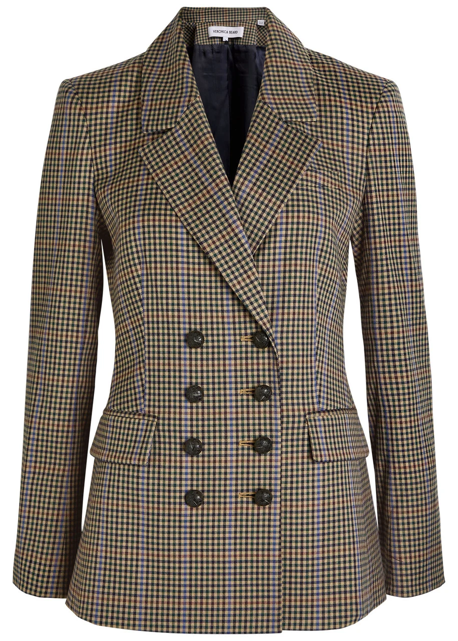 Info & Care Veronica Beard woven;blazer Plaid, notched lapels, padded shoulders, button-fastening cuffs, chest slit pocket,;darts through waist, front flap pockets, back vent, fully lined Partially concealed zip and double-breasted button fastenings through front 63% polyester, 34% viscose, 3% elastane; lining: 100% cupro Dry clean; Size & Fit Length shoulder to hem: 27 inches/ 68.5cm Midweight Slim fit, fitted at the waist Model is 5'9"/ 175cm and wears a size;US4