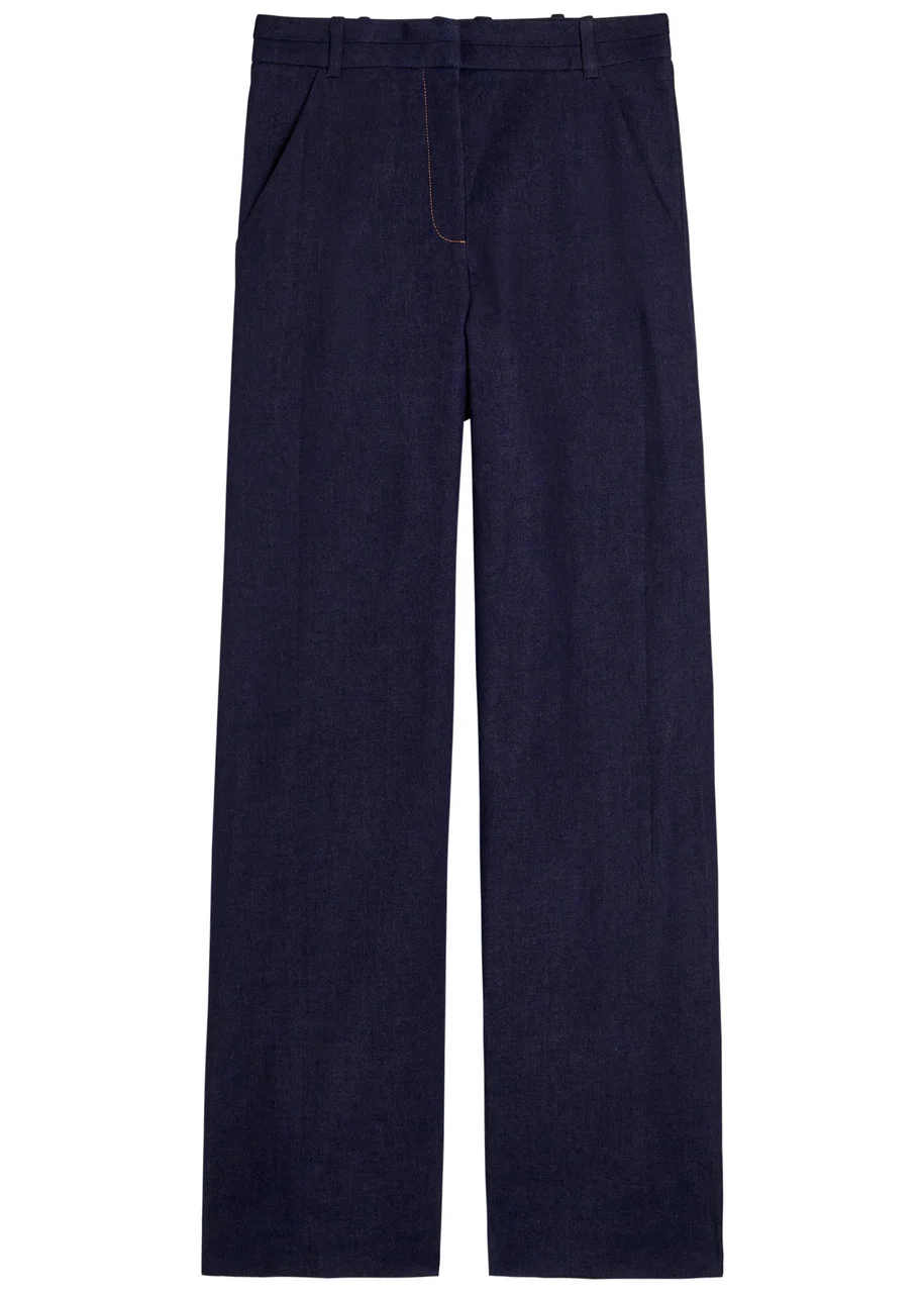 Info & Care Veronica Beard stretch-denim trousers Pintuck across waistband, belt loops with logo detail, side slip pockets, faux back slit pockets Concealed zip and hook fastenings at front 75% cotton, 23% polyester, 2% elastane Dry clean Size & Fit Inside leg length: 34 inches/ 86.5cm Midweight Wide-leg cut, slim across high-rise;waist Model is 5'10"/ 178cm and wears a size;US4