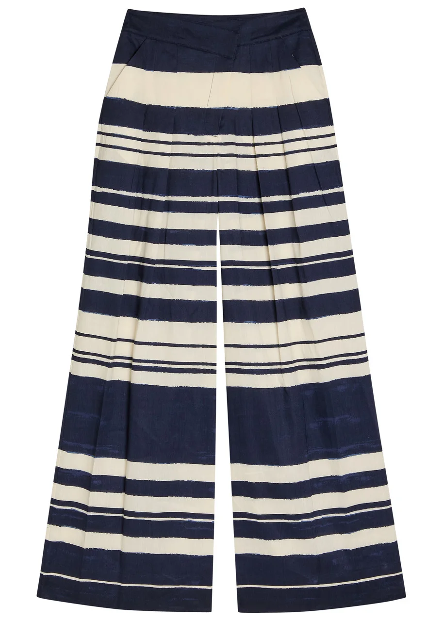 Info & Care Veronica Beard linen-blend trousers Stripes, pleats at waist, side slip pockets, back slit pockets Concealed button, hook and zip fastening at front 55% linen, 42% viscose, 3% elastane Dry clean Size & Fit Inside leg length: 34 inches/ 86.5cm Midweight High-rise fit, wide-leg cut Model is 5'9"/ 175cm and wears a size;US4