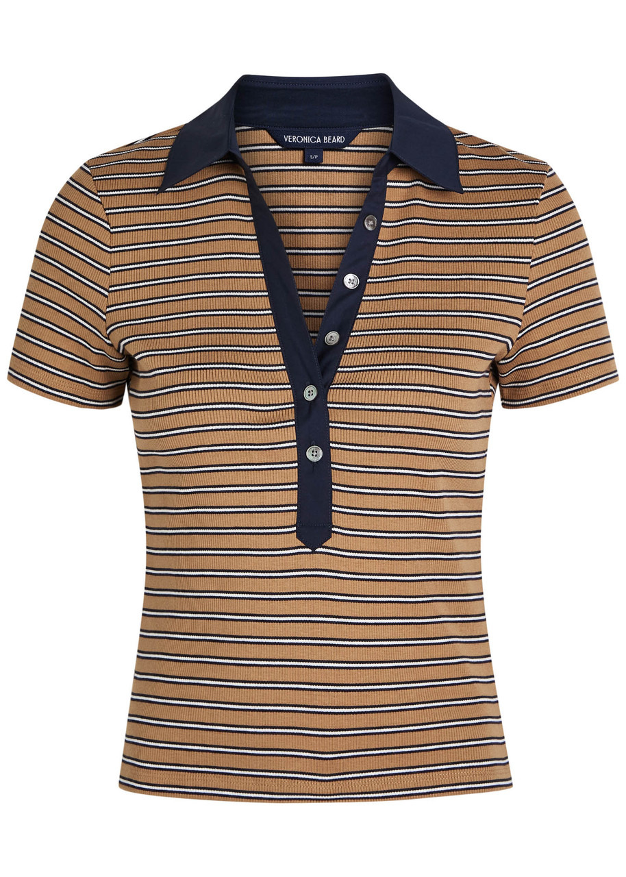 Info & Care Veronica Beard stretch-cotton top Striped intarsia, ribbed, cotton-blend poplin collar, button-fastening neck Slips on Fabric 1: 96% cotton, 4% elastane; fabric 2: 67% cotton, 30% nylon, 3% elastane Machine wash Size & Fit Length shoulder to hem: 20.5 inches/ 52cm Midweight Regular;fit Model is 5'9"/ 175cm and wears a size small