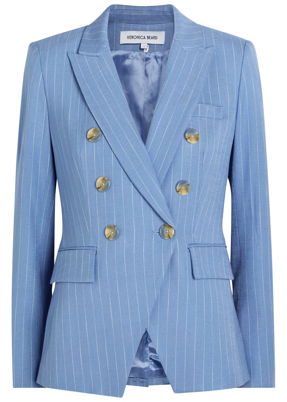 Info & Care Veronica Beard crepe blazer Pinstripe, padded shoulders, peaked lapels, button-fastening cuffs, faux chest slit pocket, two faux flap pockets, back vent, fully lined Double-breasted button fastening at front 98% viscose, 2% elastane; lining 1: 100% viscose; lining 2: 95% polyester, 5% elastane; Dry clean; Size & Fit Length shoulder to hem: 26 inches/ 66cm Midweight Tailored style, fitted at the waist Model is 5'9"/ 175cm and wears a size US4