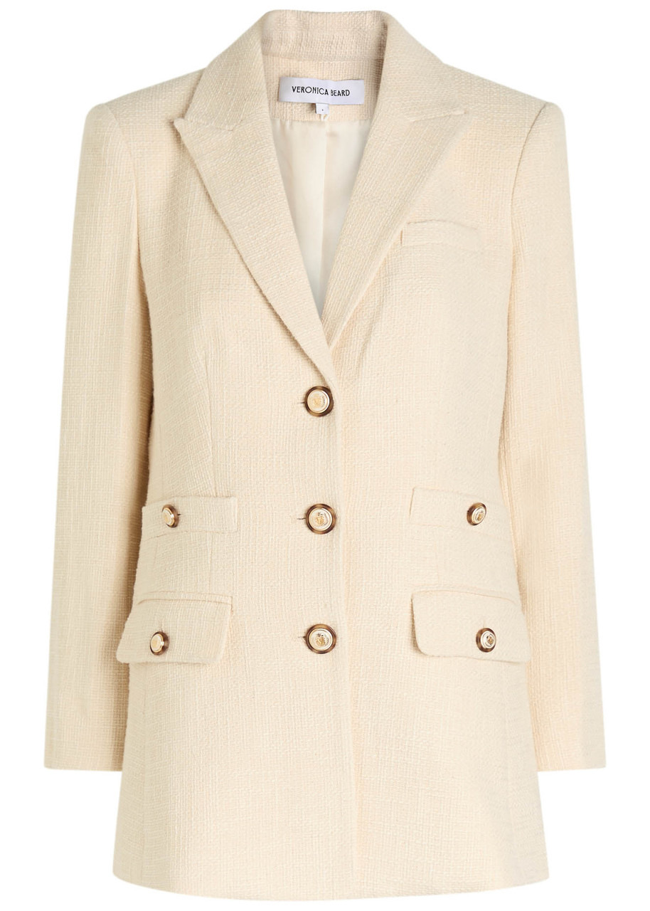 Info & Care Veronica Beard tweed;blazer Peaked lapels, padded shoulders, button-fastening cuffs, chest slit pocket, two front slit pockets, two front flap pockets, enamelled designer-engraved hardware, back vents, internal zip-fastening pocket, fully lined 100% cotton; lining: 100% cupro Dry clean Size & Fit Length shoulder to hem: 28 inches/ 71cm Midweight; Slim fit Model is 5'9"/ 175cm and wears a size;US4