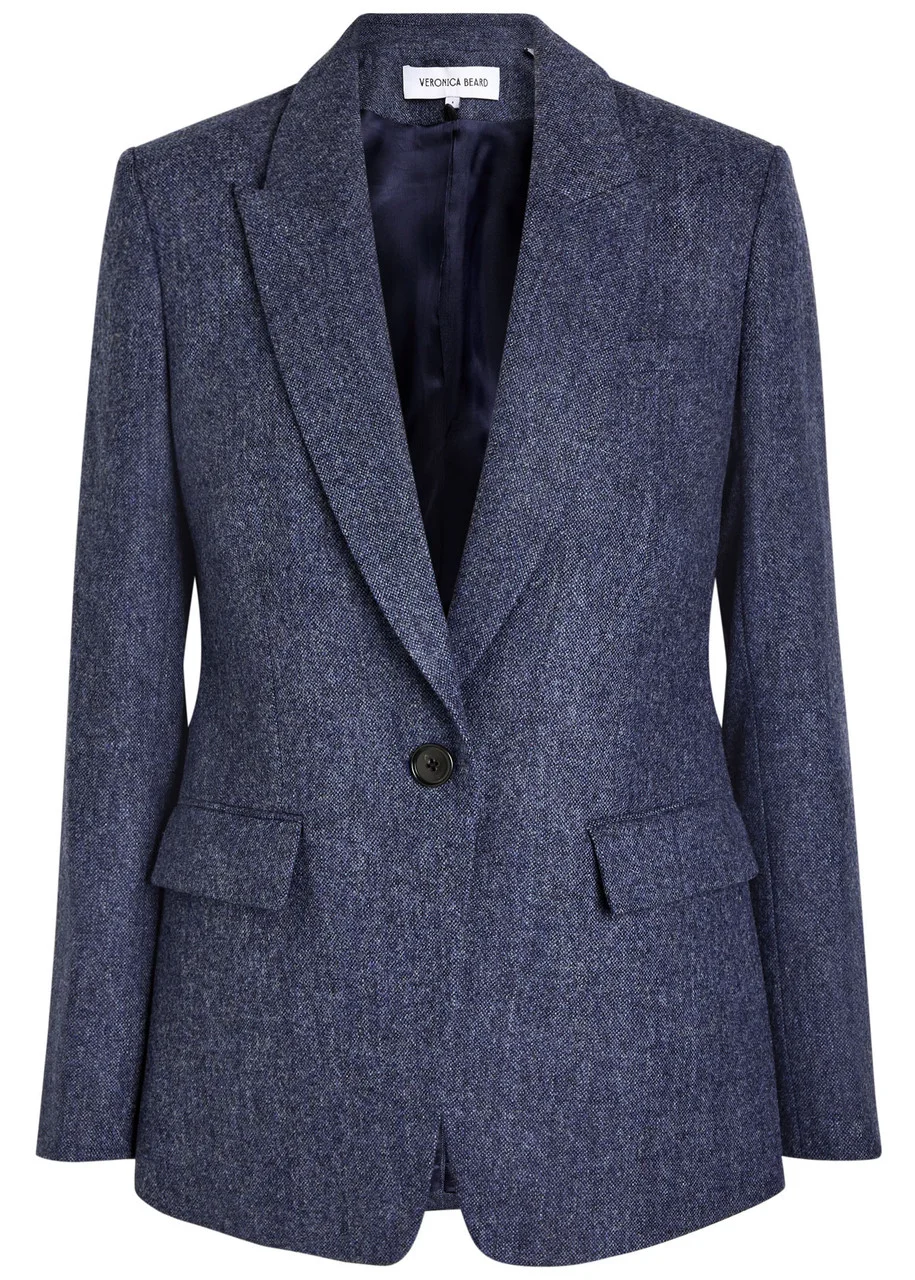 Info & Care Veronica Beard wool blazer Melange finish, peaked lapels, padded shoulders, button-fastening cuffs, chest slit pocket,;darts through waist, front flap pockets, back vent, fully lined Partially concealed zip and button fastening at front 100% wool; lining: 100%;viscose Dry clean; Size & Fit Length shoulder to hem: 27.5 inches/ 70cm Midweight Regular fit, fitted at the waist Model is 5'9"/ 175cm and wears a size;US4