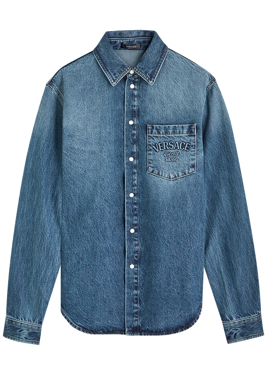 Info & Care Versace denim shirt; Pleats at press-stud fastening cuffs, designer-embossed chest patch pocket, curved hem, faded finish Button fastenings through front; 100% cotton; Machine wash inside out to avoid colour transfer Size & Fit Length shoulder to hem: 28 inches/ 71cm Midweight Loose fit Model is 6'1"/ 185cm, chest size 38 inches and wears a size;IT48