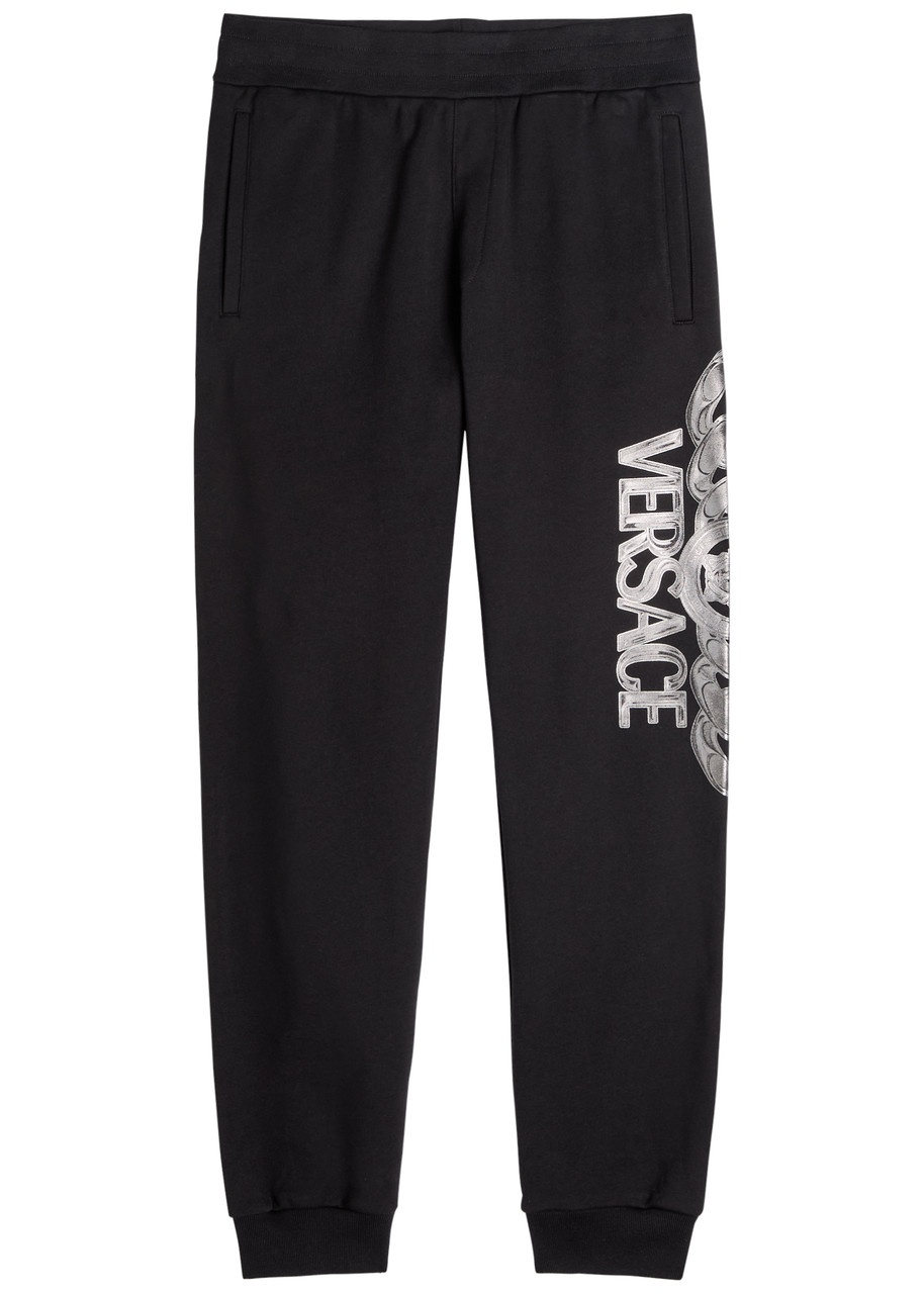 Info & Care Versace cotton;sweatpants Concealed drawstring at elasticated waist, two side slip pockets, metallic logo print through leg, back patch pocket, ribbed trims; Pull on 100%;cotton; Machine wash; Size & Fit Inside leg length: 31 inches/ 79cm Midweight Slim-leg cut Model is 6'2"/ 188cm;and wears a size medium