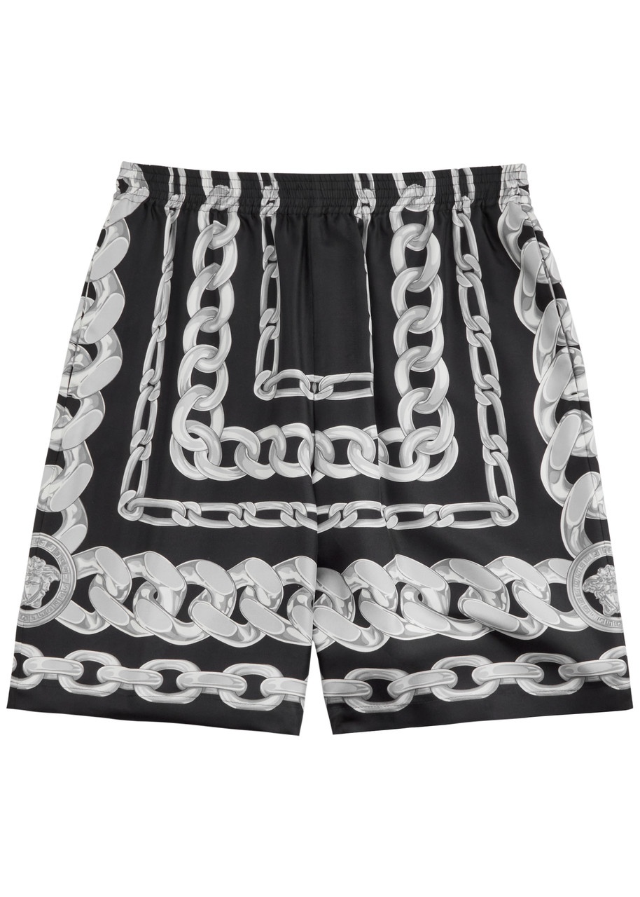 Info & Care Versace silk-twill shorts; Printed, elasticated waistband, side slip pockets, faux fly, back slit pocket, fully lined Pull on 100% silk Dry clean Size & Fit Length waist to hem: 22 inches/ 56cm Midweight Loose fit, slim at waist Model is 6'1"/ 185cm and wears a size;IT48