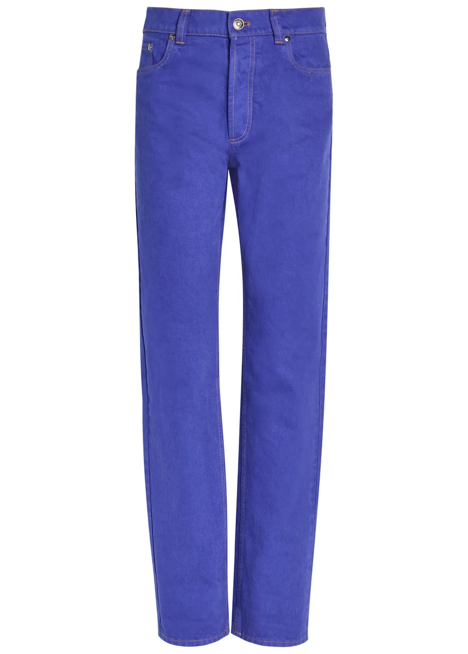 Info & Care Versace denim jeans; Mid-rise fit, straight-leg cut, belt loops, five pockets, designer plaque at back Partially concealed button fastenings at front; 100% cotton Machine wash cold inside out to avoid colour transfer Size & Fit Front rise: 11 inches/ 28cm Inside leg length: 34 inches/ 86.5cm Midweight Model is 5'10"/ 178cm and wears a size;W27