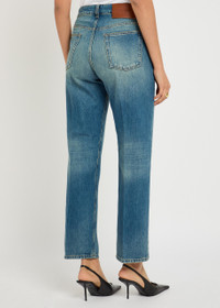 Info & Care Victoria Beckham denim jeans Mid-rise fit, straight-leg cut, belt loops, five pockets, designer plaque at back,; slightly distressed trims, whiskered, faded finish Concealed zip and button fastening at front 100% cotton Machine wash cold inside out to avoid colour transfer Size & Fit Front rise: 11 inches/ 28cm Inside leg length: 29.5 inches/ 75cm Midweight Model is 5'10"/ 178cm and wears a size;W27