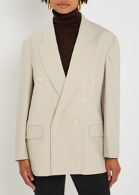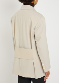 Info & Care Victoria Beckham woven blazer Peaked lapels, button-fastening cuffs, darted, chest pocket, two flap pockets at front, elasticated panel at back,;internal button-fastening pocket, fully lined Double-breasted button fastenings through front 53% polyester, 43% wool, 4% elastane; lining 1: 100% viscose; lining 2: 70% cotton, 30% polyamide; trims: 90% cotton, 10% elastane Dry clean; Size & Fit Length shoulder to hem: 29 inches/ 73.5cm Midweight Slightly relaxed fit Model is 5'9"/ 175cm and wears a size;UK8