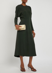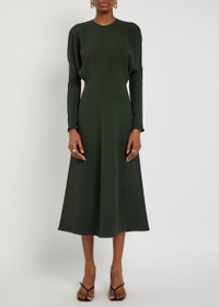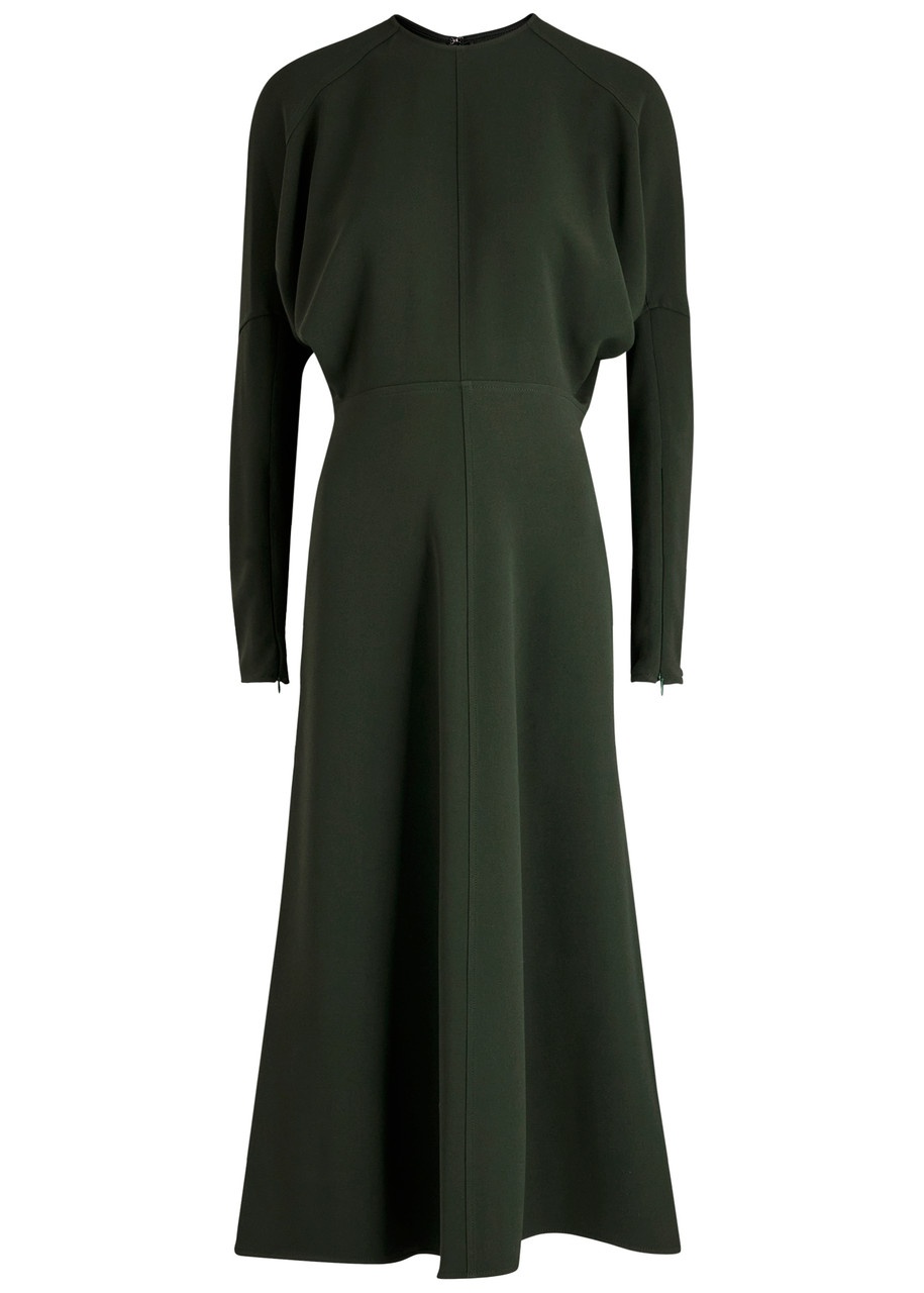Info & Care Victoria Beckham crepe dress Round-neck, panelled dolman sleeves, zip-fastening cuffs, draped bodice, curved hem Concealed zip fastening at back 50% viscose, 47% acetate, 3% elastane Dry clean Size & Fit Length shoulder to hem: 49 inches/ 124.5cm Midweight Relaxed fit, slim across the waist Model is 5'9"/ 175cm and wears a size UK8