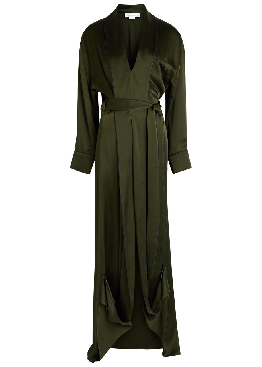 Info & Care Victoria Beckham satin;gown V-neck, dropped shoudlers, button-fastening cuffs, draped wrap-effect front, chest patch pocket, detachable waist tie, pleats at back waist, draped front hem,;longer back hem Concealed zip fastening at side 71% acetate, 29% viscose Dry clean Size & Fit Length shoulder to hem: front: 58.5 inches/ 149cm; back: 65 inches/ 165cm Midweihgt Relaxed fit, use tie to cinch the waist Model is 5'9"/ 175cm and wears a size;UK8