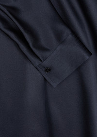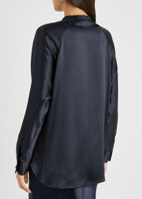 INFO & CARE - Hand wash - Length shoulder to hem: 27.5 inches/ 70cm; back: 28.5 inches/ 72.5cm - Midweight - Loose fit - Model is 5'9"/ 175cm and wears a size small SIZE & FIT - Vince navy silk blouse - Stand collar concealed button fastenings at V-neck dolman sleeves button-fastening cuffs seam detail at cuffs side splits curved hem longer back hem - Slips on - 100% silk