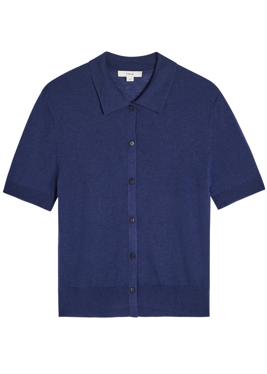 Info & Care Vince wool and cashmere-blend top Collar, ribbed trims Button fastenings through front; 73% wool, 21% polyester, 6% cashmere; Hand wash Size & Fit Length shoulder to hem: 21 inches/ 53cm Midweight Slim fit Model is 5'10"/ 178cm and wears a size small