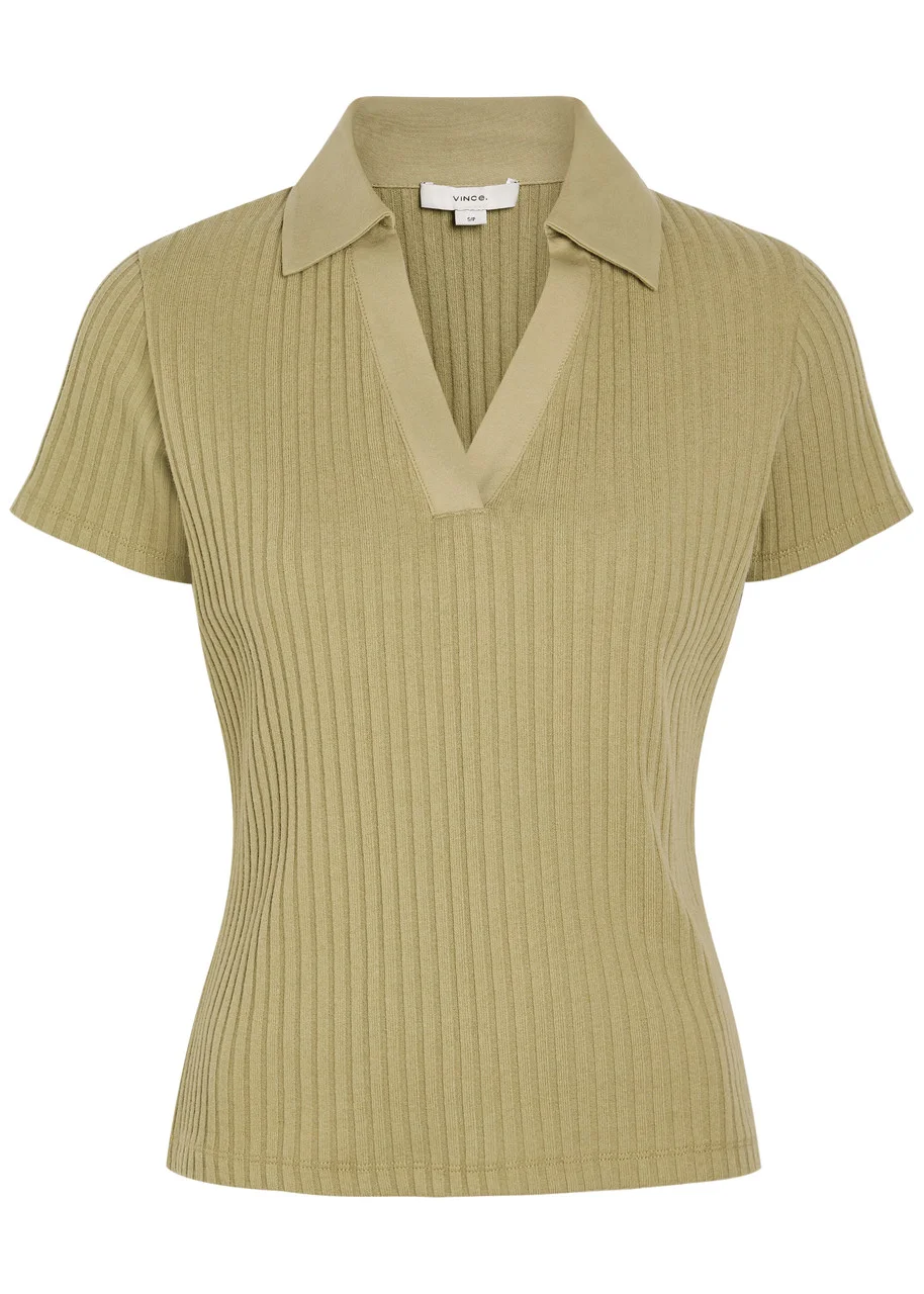 Info & Care Vince cotton-blend polo top Ribbed knit, open collar Slips on; 78% cotton, 20% polyester, 2% spandex Hand wash Size & Fit Length shoulder to hem: 22 inches/ 56cm Midweight Slim fit Model is 5'9"/ 175cm and wears a size small