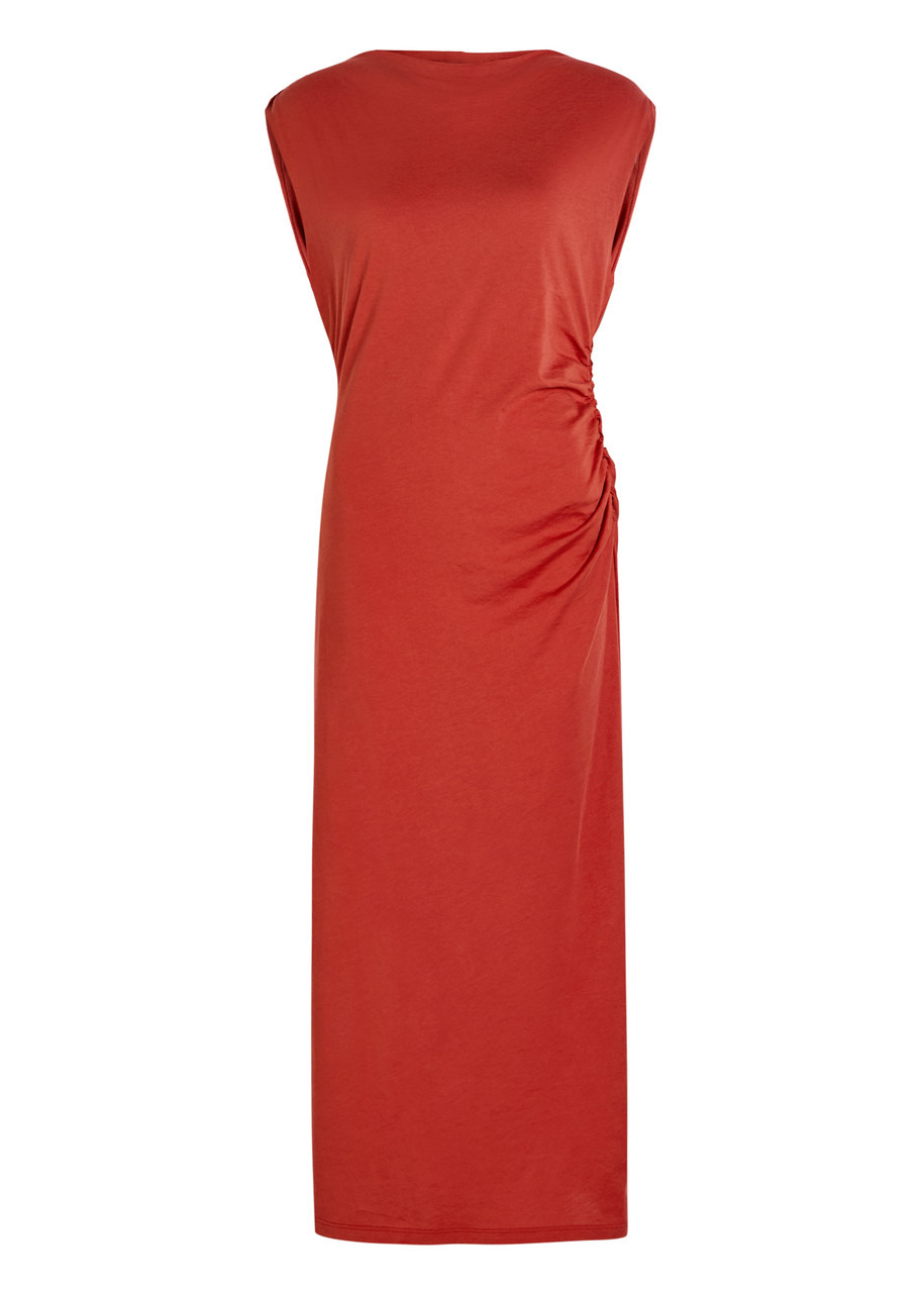 Info & Care Vince cotton jersey dress Cowl neck, ruching at shoulders and waist; Slips on 100% pima cotton Machine wash Size & Fit Length shoulder to hem: 50 inches/ 127cm Midweight Relaxed fit, cinched at the waist Model is 5'10"/ 178cm and wears a size small