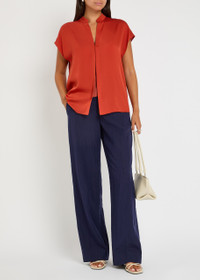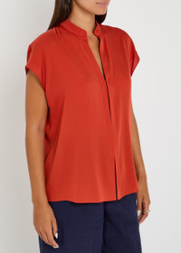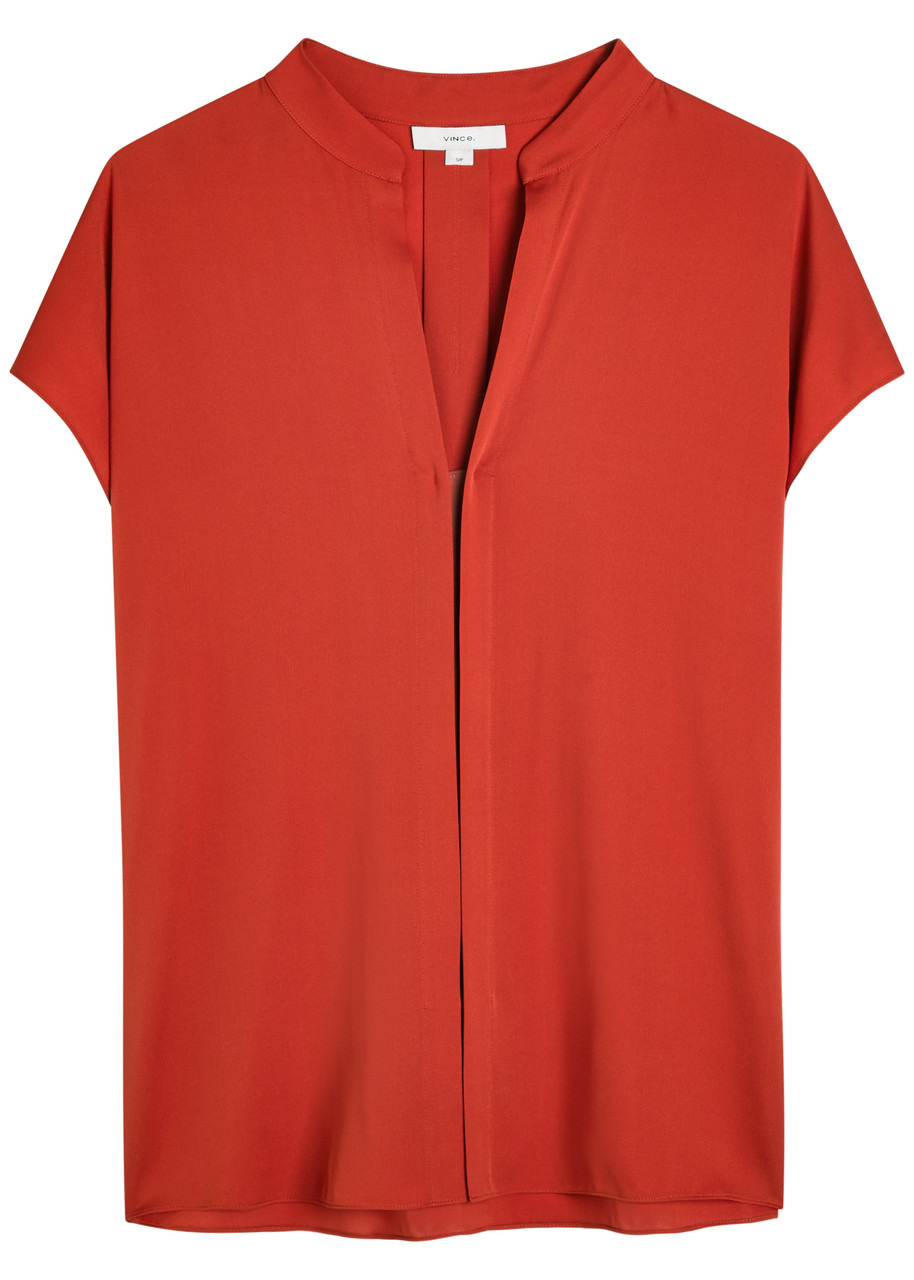 Info & Care Vince stretch-silk blouse Stand collar with cut-out neck, cap sleeves, inverted box pleat at back, curved hem Slips on 92% silk, 8% spandex Hand wash Size & Fit Length shoulder to hem: 26 inches/ 66cm Midweight Loose fit Model is 5'8"/ 173cm and wears a size small