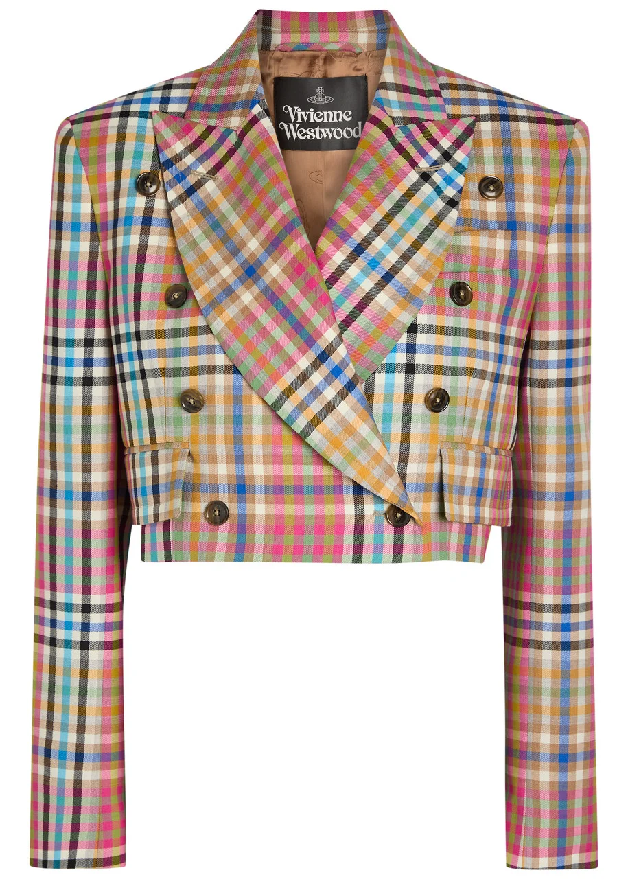 Info & Care Vivienne Westwood wool jacket Checked, peaked lapels, padded shoulders, button-fastening cuffs, chest slit pocket, front flap pockets, fully lined Double-breasted button fastenings through front 100% virgin wool; lining: 100% viscose Dry clean Coordinating item available Size & Fit Length shoulder to hem: 16.5 inches/ 42cm Midweight Boxy fit, cropped Model is 5'10"/ 178cm and wears a size;IT40