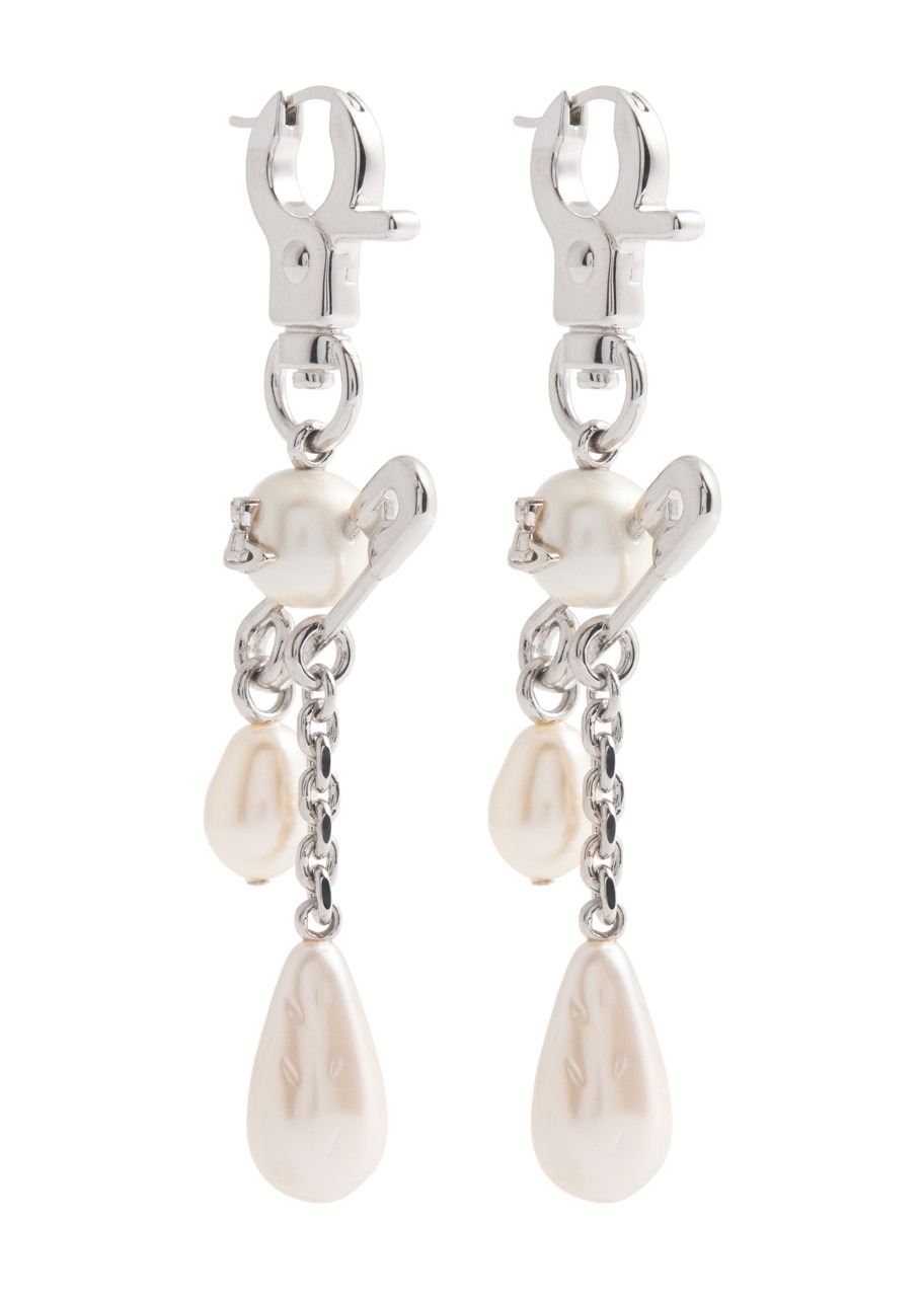 Info & Care Vivienne Westwood drop earrings Lobster clasp and safety pin detail, pearl embellishments, orb plaque Sleeper-fastening for pierced ears Presented in a designer-stamped box; Gift boxes are subject to availability; Please note, we are unable to refund or exchange for pierced earrings Size & Fit Drop: 8cm