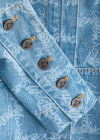 Info & Care Vivienne Westwood denim jacket; Stand collar, logo monogrammed print, contrast stitching, pleated details at puff sleeves, button-fastening cuffs, designer engraved buttons, two slip pockets, curved front hem, darted waist, faded finish Concealed two-way zip-fastening through front; 100% cotton; Machine wash cold inside out to avoid colour transfer; Size & Fit Length shoulder to hem: 19.5 inches/ 49.5cm; 2: 22 inches/ 56cm Midweight; Regular fit Model is 5'9"/ 175cm and wears a size small;