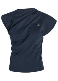Info & Care Vivienne Westwood cotton T-shirt; Asymmetric neck,;dolman sleeves, gathered side,;Orb embroidery at chest, darted back, draped details Slips on; 100% cotton; Machine wash; Size & Fit Length shoulder to hem: 22.5 inches/ 57cm Midweight; Regular fit, cinched at waist Model is 5'10"/ 178cm and wears a size small;