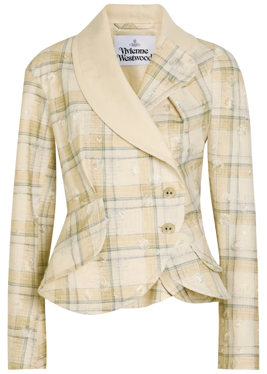 Info & Care Vivienne Westwood cotton-blend jacket Checked, shawl lapels, front flap pocket, distressed details, curved hem, fully lined Partially concealed button fastenings at front 81%;cotton, 18% viscose, 1% elastane; lining: 100% viscose Dry clean Size & Fit Length shoulder to hem: 21 inches/ 53cm Midweight Fiitted style, cinched at waist Flared hem Model is 5'10"/ 178cm and wears a size IT40