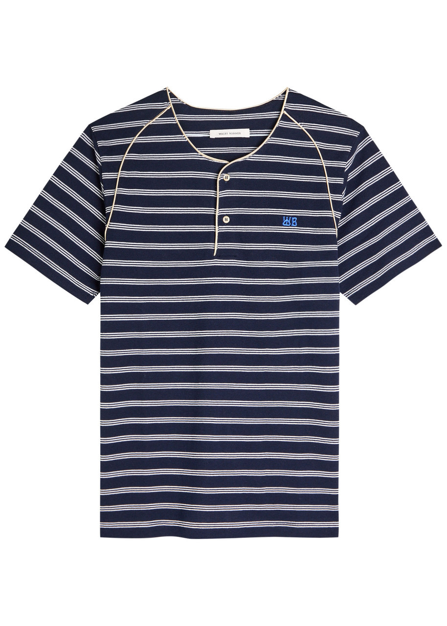 Info & Care Wales Bonner pique cotton-blend T-shirt Striped, button-fastening crew-neck, raglan sleeves, logo embroidery at chest and back, piped satin trims Slips on 95% cotton, 4% polyester, 1% elastane Machine wash Size & Fit Length shoulder to hem: 27 inches/ 68.5cm Midweight Relaxed fit Model is 6'1"/ 185cm, chest size 36 inches and wears a size medium