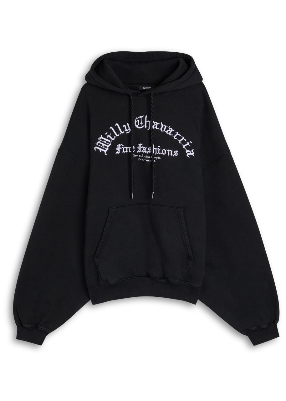 Info & Care Willy Chavarria cotton;sweatshirt Drawstring hood, dropped shoulders, balloon sleeves, designer-embroidered chest, front pouch pocket, ribbed trims Slips on; 100% cotton Dry clean; Size & Fit Length shoulder to hem: 31 inches/ 79cm Midweight Designed to be worn oversized, cut for relaxed fit Model is 6'1"/ 185cm, chest size 38 inches and wears a size medium