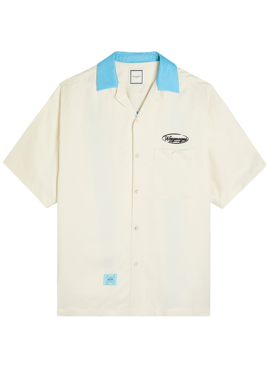 Info & Care Wooyoungmi satin shirt Contrasting camp collar, dropped shoulders, logo embroidery at chest and back, button-fastening chest patch pocket, designer plaque;at hem and back, contrasting inverted pleats through back, side splits; Button fastenings through front 100%;viscose Dry clean Size & Fit Length shoulder to hem: 30 inches/ 76.5cm Midweight Relaxed, boxy fit Oversized style Model is 6'2"/ 188cm, chest size 38 inches and wears a size;IT48