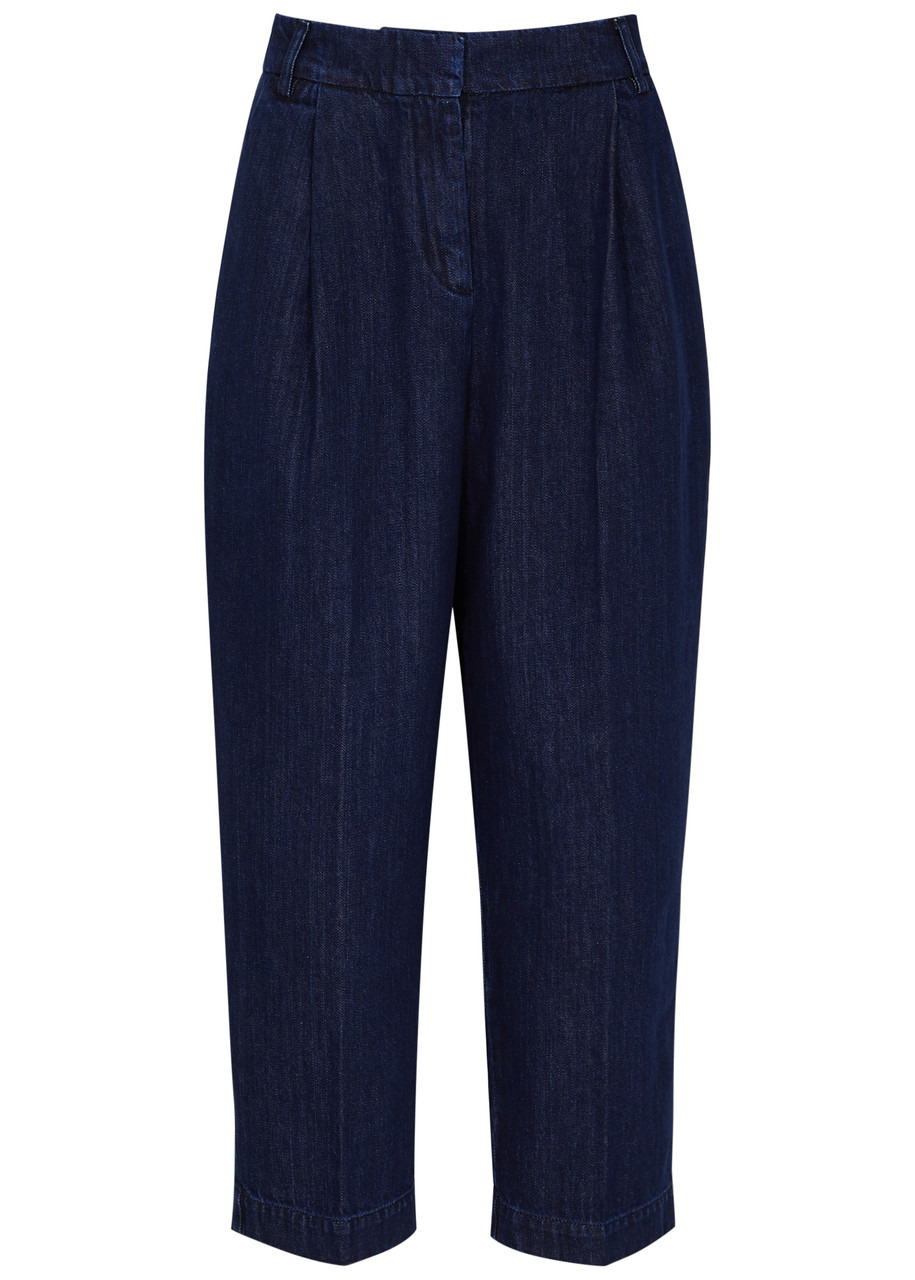 INFO & CARE - YMC denim trousers - Belt loops, two slip pockets, pleated details at waist, pressed creases through legs, slightly faded finish, cropped - Concealed button, hook and zip fastenings at waist - 100% organic cotton - Machine wash cold inside out to avoid colour transfer SIZE & FIT - Inside leg length: 23.5 inches/ 59.5cm - Midweight - Tapered-leg cut - Model is 5'10"/ 178cm and wears a size small