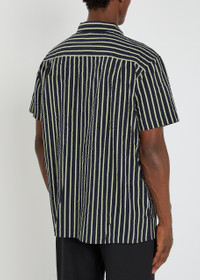 Info & Care YMC;seersucker shirt Striped,;chest patch pocket, box pleat at back Button fastenings through front 100% cotton Machine wash Size & Fit Length shoulder to hem: 28 inches/ 71cm Midweight Boxy, relaxed fit Model is 6'1"/ 185cm, chest size 38.5 inches and wears a size medium
