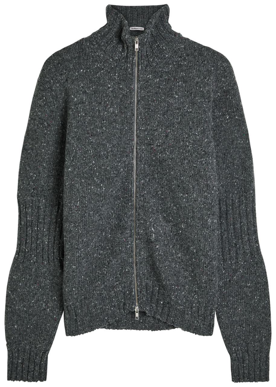 Info & Care YMC wool-blend;cardigan Flecked finish, high-neck, ribbed elbows and trims Two-way zip fastening through front 80% virgin wool, 20% polyamide Hand wash Size & Fit Length shoulder to hem: 27 inches/ 68.5cm Midweight Relaxed fit Model is 6'1"/ 185cm, chest size 38.5 inches and wears a size medium