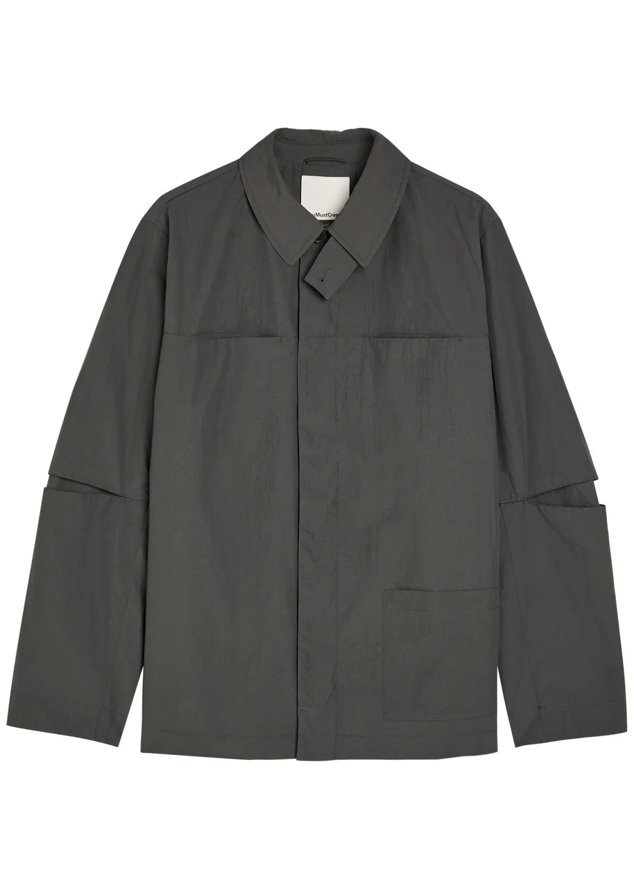 Info & Care YMC shell jacket Wrap around button-fastening neck, inverted pleat at sleeve, chest slit pockets, front patch pocket, internal patch pocket, fully lined, water repellent finish; Partially concealed button fastening through front 75% recycled polyamide, 25% cotton; lining: 100% cotton; sleeve lining: 100% viscose Machine wash; Coordinating item availible Size & Fit Length shoulder to hem: 27.5 inches/ 70.5cm Midweight Boxy;fit Model is 6'1"/ 185cm, chest size 36 inches and wears a size medium